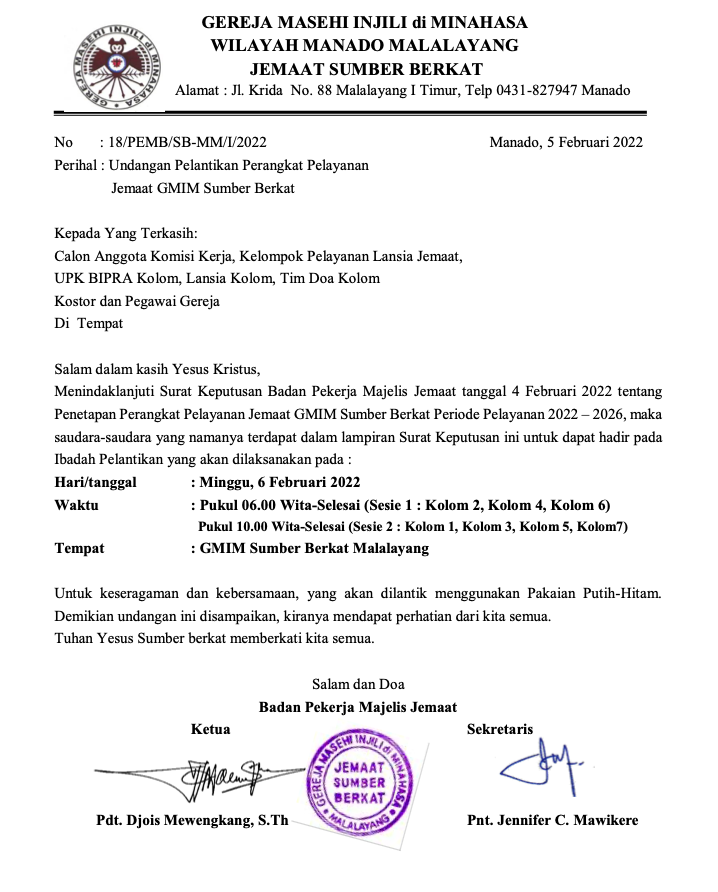 Undangan Pelantikan Perangkat Pelayanan Jemaat GMIM Sumber Berkat